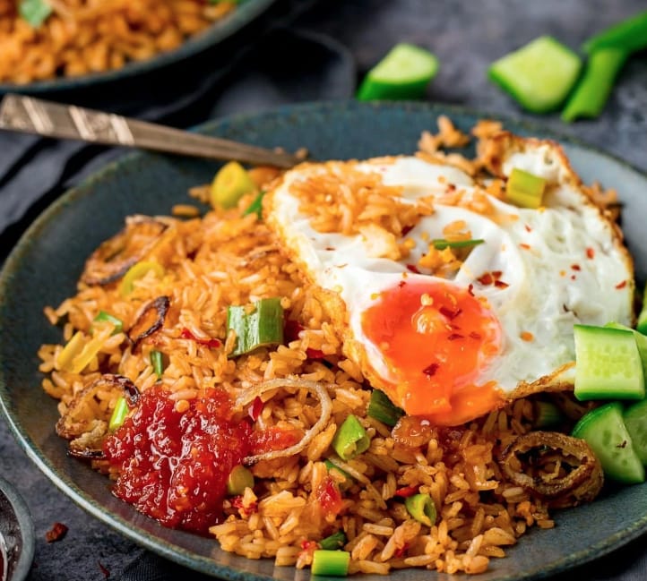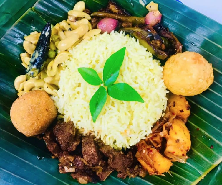 15,90€Riz cuit dans un bouillon avec 3 currys, friand et piment maison, servi dans une feuille de bananier